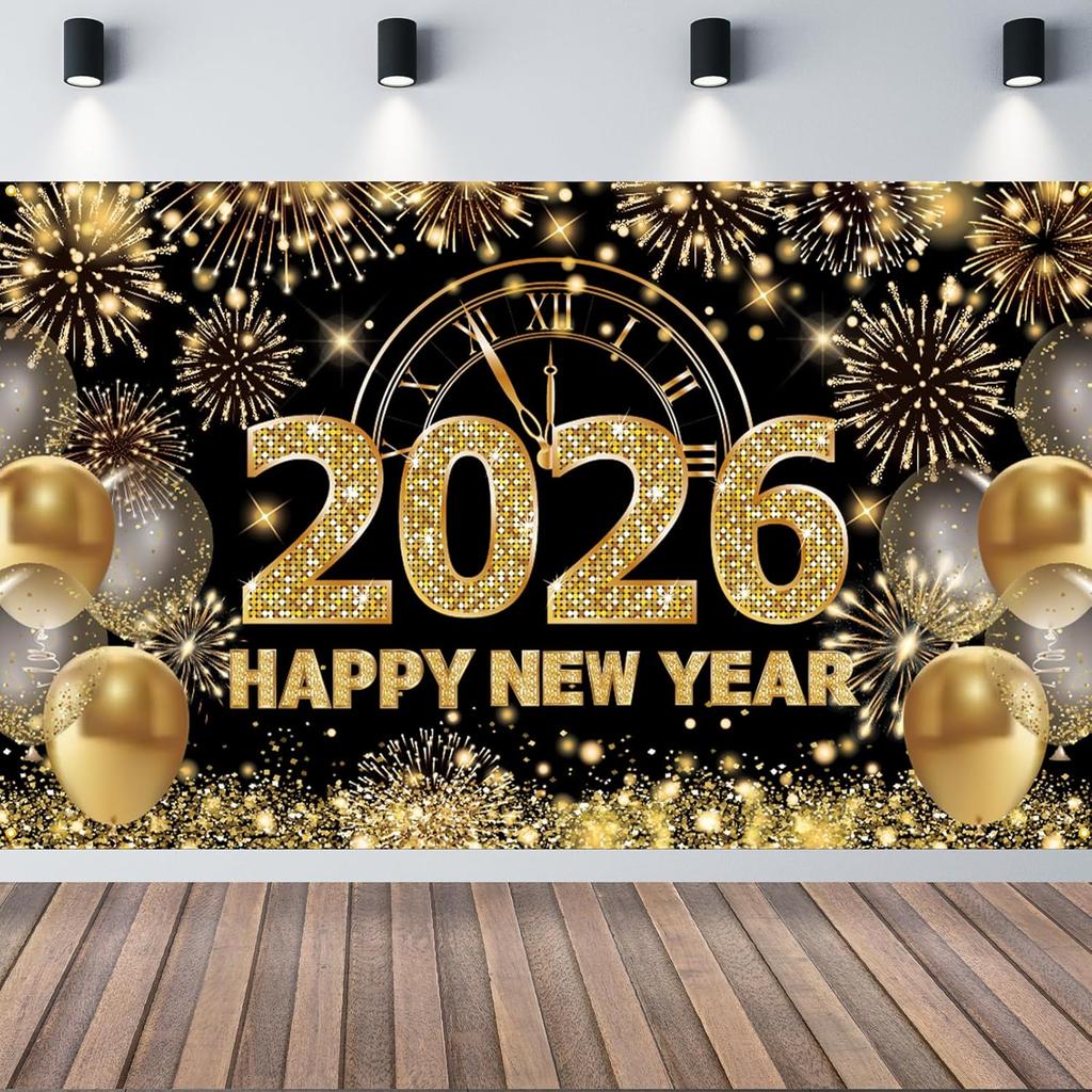 Black Gold Happy New Year 2026 Banner, New Years Eve 2026 Banner, NYE Party Decorations Photo Background for Boys, Girls, Friends, Celebrations Party