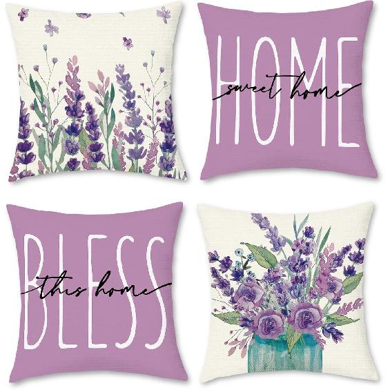 Throw Pillow Covers 16x16 Inch Set of 4,Lavender Home Sweet Purple Pillow Cases for Couch Sofa Outdoor Home Decorations