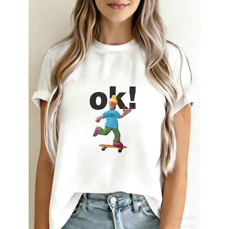 Cotton T Shirt White Skateboarder Cartoon Print Ok Text Casual Wear For Women Summer Outfit Street Style Top