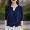 Women's V-Neck Half Button-Down Three-Quarter Sleeve Knit Top Loose Fit Casual Commute Top