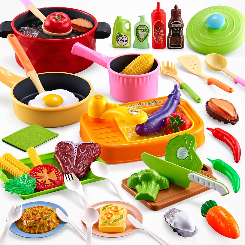 COMPLETE KIDS' KITCHEN PLAY FOOD SET: This 47-piece kids' kitchen set includes pots and pans, a kitchen sink, and a variety of cooking utensils for your child's toy kitchen. This kids' kitchen set comes with 3 different flavors to match the knives, forks, and plates. Pretend play makes kids feel like they're there.