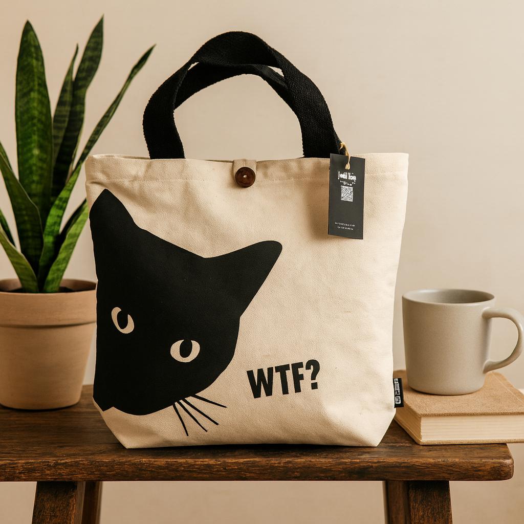 On the front, a bold black cat peeks from the corner—crisp lines, white eyes, a whisker’s curve—balanced by a cheeky “WTF?” in clean type. It’s a playful note with a straight face, adding character without shouting. 🐈⬛