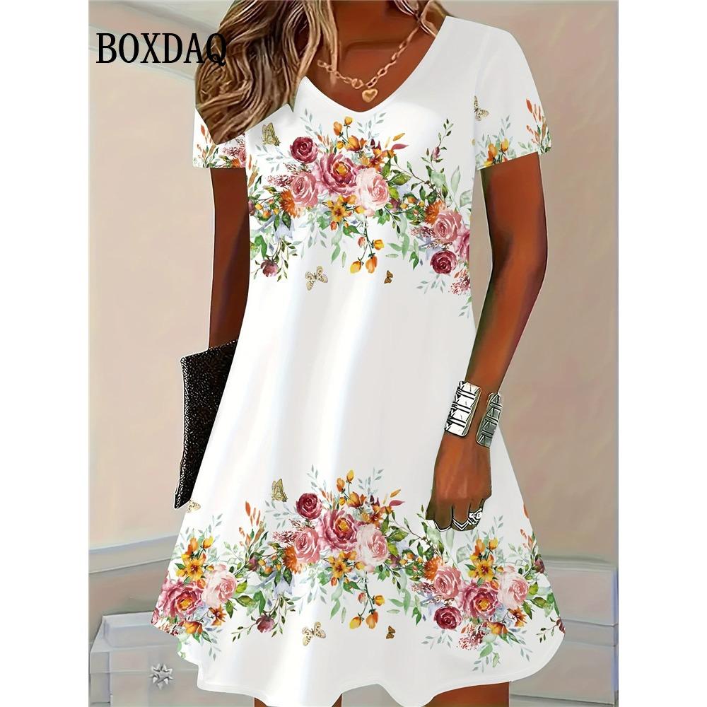 Summer 3D Print Dresses Women Fashion Pullover Short Sleeve V-Neck Dress Casual Retro Flowers Loose Plus Size Female Clothing