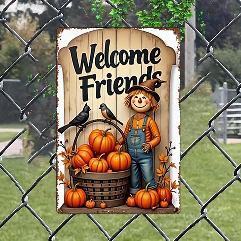 Vintage Metal Welcome Sign Rustic Farmhouse Decor with Pumpkin Basket Scarecrow Birds Iron Wall Hanging for Halloween