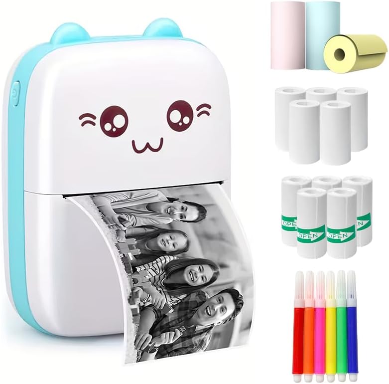 Compact & Portable Design: This upgraded portable printer is ultra-compact, measuring just 4.3L * 3.2W * 1.4H inches. It’s lightweight and easy to carry, making it perfect for printing on the go. Whether for work, school, or personal use, it’s a convenient solution for printing black-and-white photos, notes, and more. Comes with 5 rolls of thermal paper, 5 rolls of self-adhesive paper, 3 rolls of colored paper, 6 colored pens, and one sticker sheet for added creativity