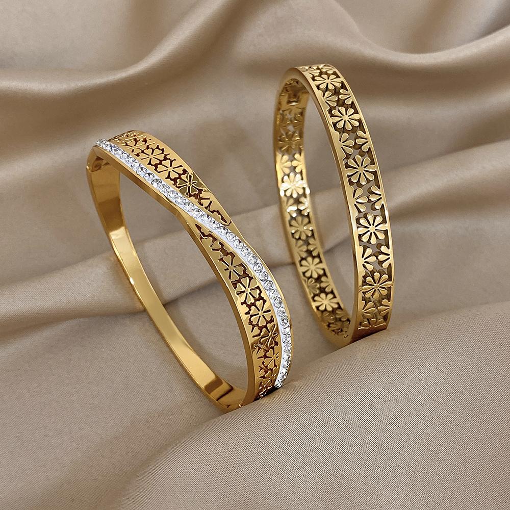 New Hollowout Flowers Rhinestones Stainless Steel Cuff Bracelet for Women Men Y2K Gold-plated Waterproof Charms Jewelry Gifts