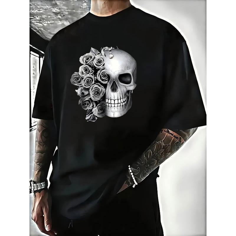 European Sizes Men'S Gothic Rose & Skull Print Oversized T-Shirt - Loose Fit Round Neck Short Sleeve, Machine Washable Comfort, Gothic Statement Top