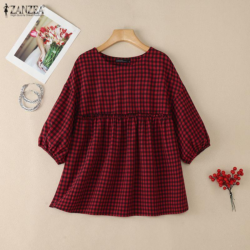 ZANZEA Women Casual Round Neck Half Sleeve Loose Plaid Print Blouse