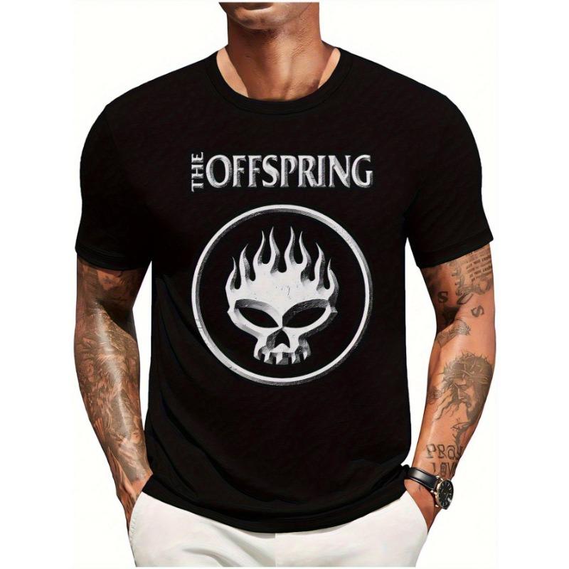 Mens The Offspring Official Band Graphic Tshirt Black Skull and Flame Punk Design Regular Round Neck Short Sleeved Tshirt
