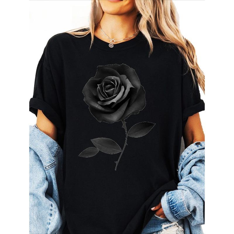 European Size Ladies Elegant Black Rose Silhouette T-Shirt-Beige Background Soft Round Neck Everyday Casual T-Shirt-All Seasons Floral Short Sleeve