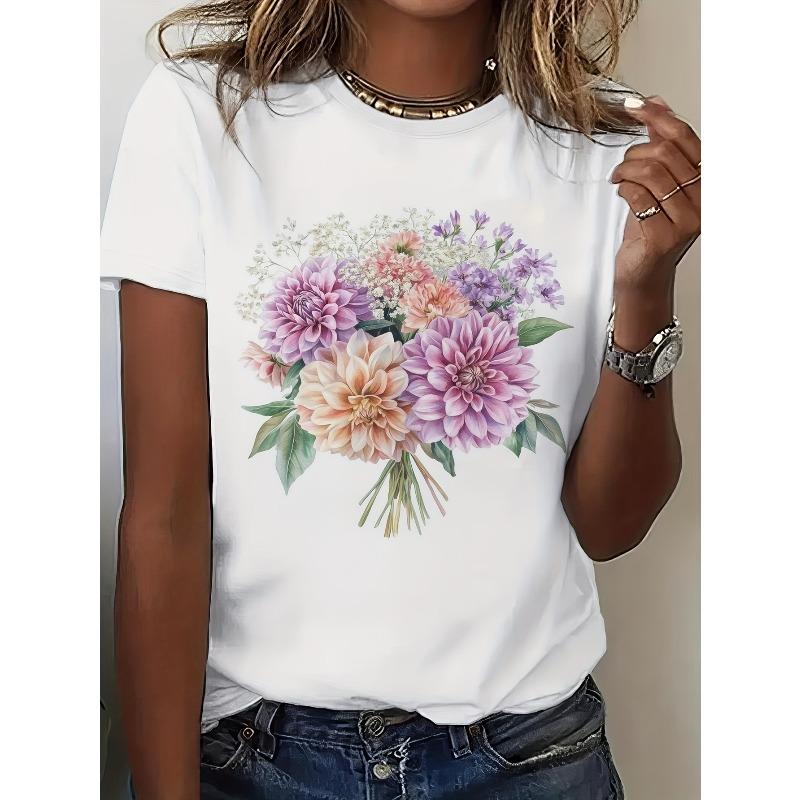 Women's Dahlia Flower Print T-Shirt - Short Sleeve Round Neck Summer Blouse with White Base & Vivid Floral Design, for Casual Wear