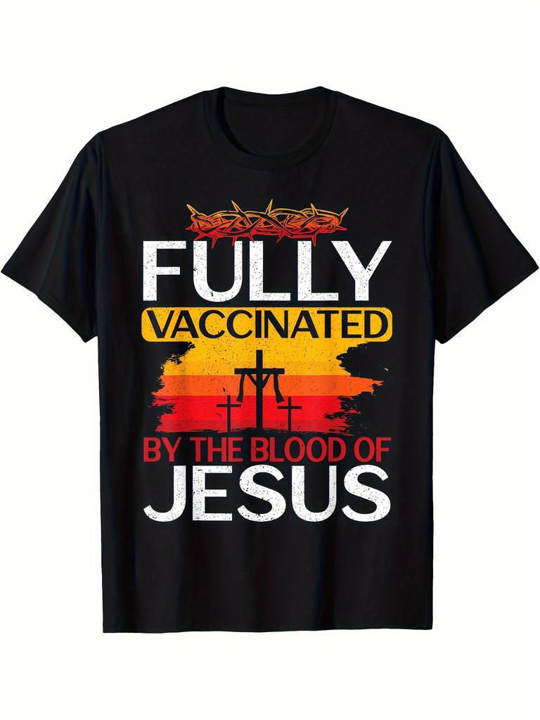 Mens Christian Faith TShirt Fully Vaccinated Against the Blood of Jesus Bold Religious Graphic Tee with Flames