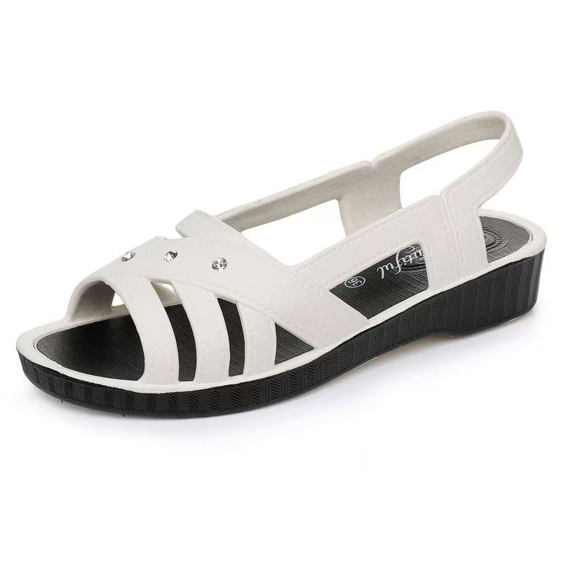 Women's Summer Flat Sole Peep Toe Beach Sandals Shallow Slip On Hollow Out Lightweight Non Slip Middle Aged And Elderly Sandal