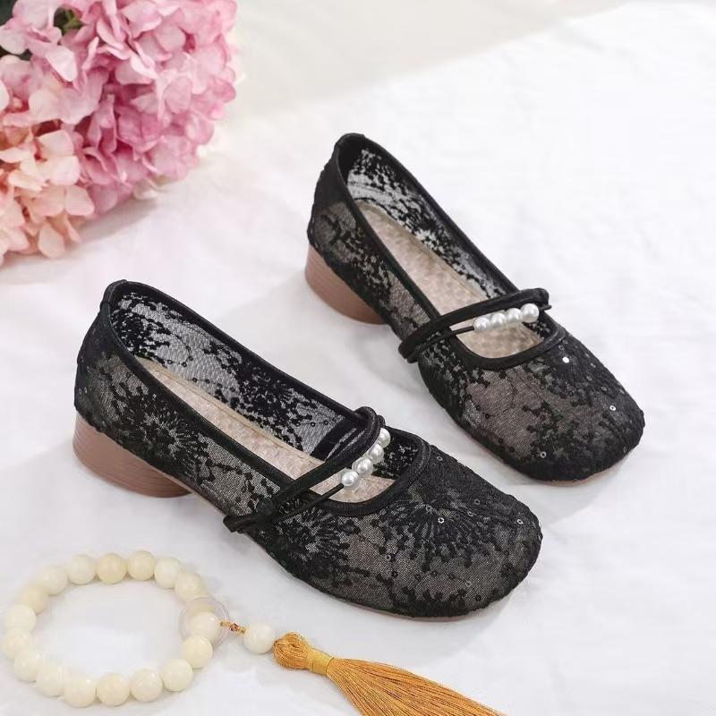Woman's Summer New Mesh Embroidered Shoes Low Heel Round Toe Shallow Slip On Mary Jane Shoes Soft Sole Non Slip Dress Sandals