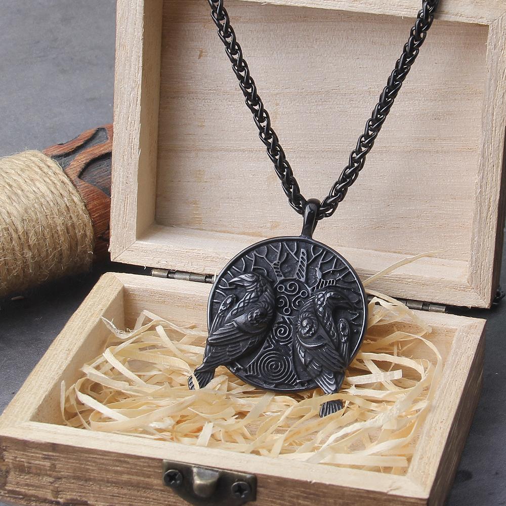 Black Norse Odin Huginn And Muninn Raven Pendant Necklace Stainless Steel Viking Amulet Jewelry