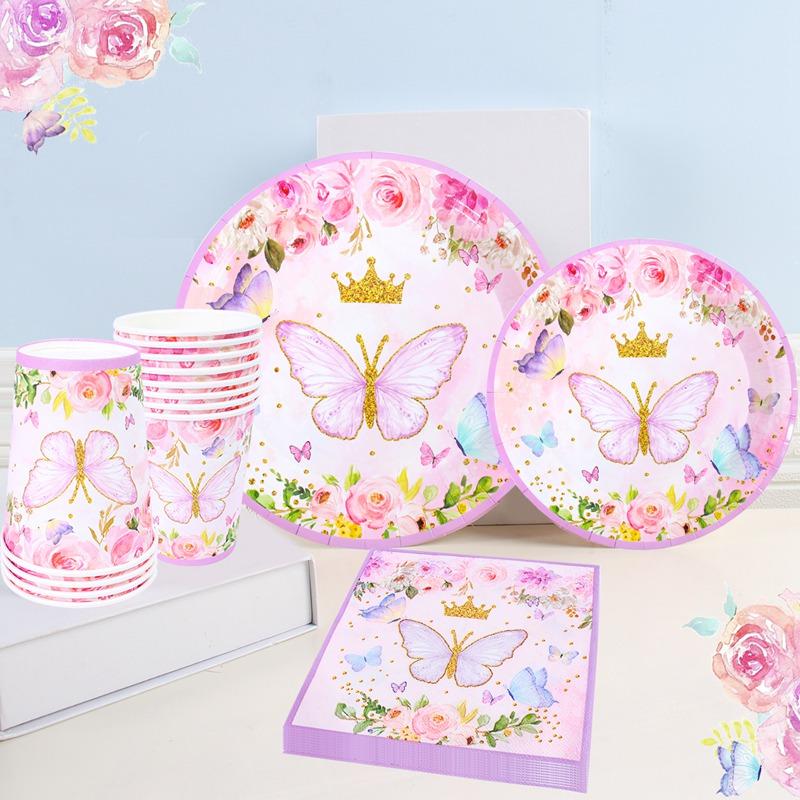 Pink Butterfly Backdrop Tableware Butterfly Birthday Party Decoration For Girl DIY Gift Butterflies Background Baby Shower Decor