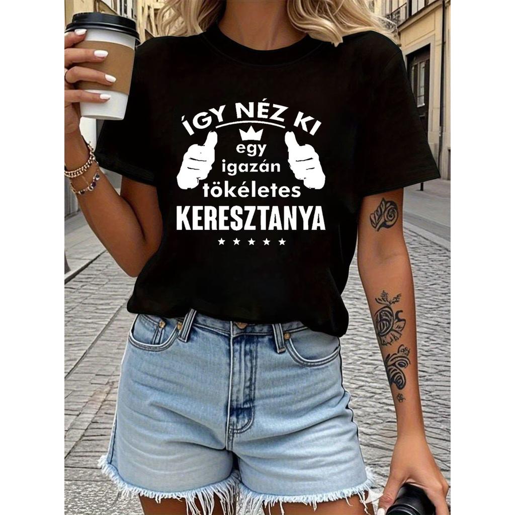 Women's Hungarian Phrase T-Shirt "ÍGY NÉZ KI Egy Igazán Perfeketty Keresztanya" - Short Sleeve Crew Neck Casual Top with Godmother Lettering