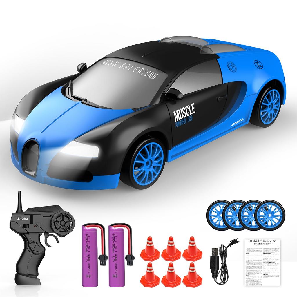 124 Scale 4WD 2.4GHz RC Drift Car with Drift Package, Replacement Tires & Cones, 40 Minutes of Continuous Running Time, USB Charging, Blue GTR,