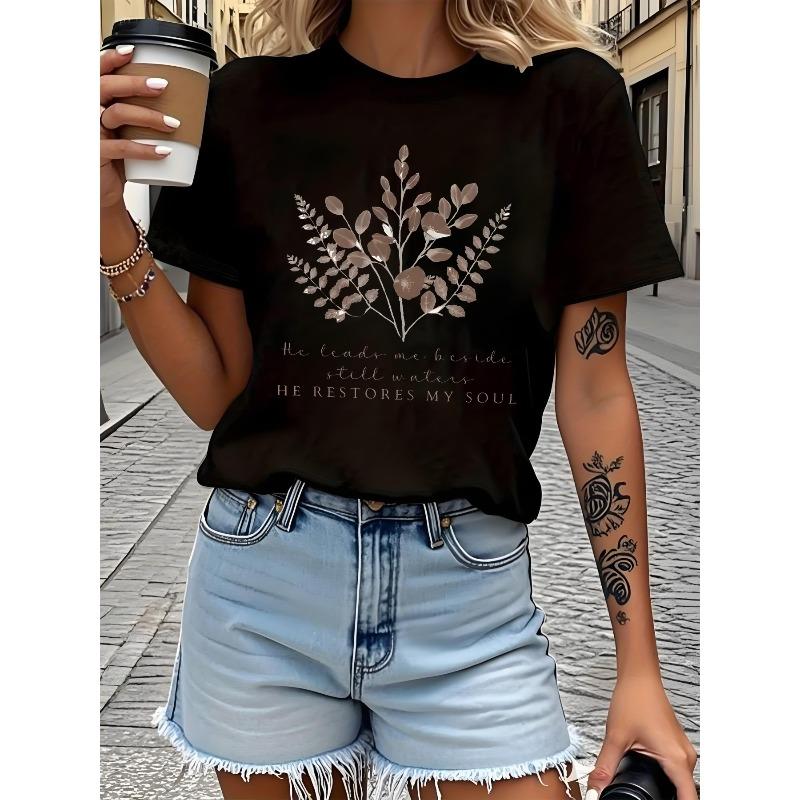 Women Floral Creative Print T-Shirt 100% Pure Soft Crew Neck Short Sleeve Regular Fit Casual Elegant Festival Essential Top