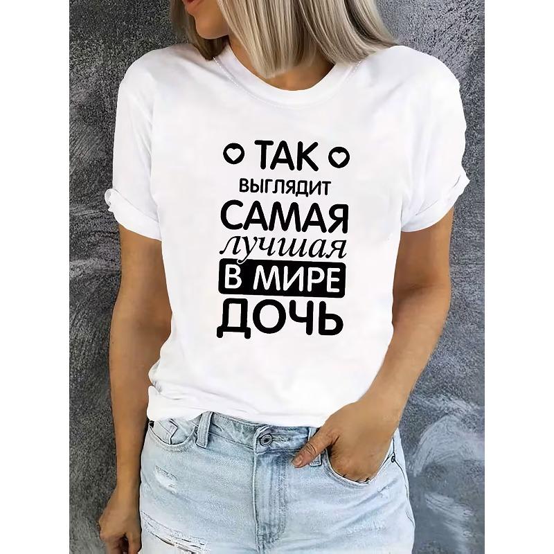 Women's Russian Best Daughter Letter Print T-Shirt Casual Crew Neck Short Sleeve Summer Top