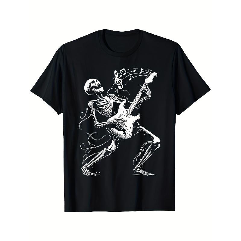 European Sizes Men'S Rock Band Skeleton Guitarist Graphic T-Shirt - Black & White Music Tee with Electric Guitar & Stage Performance Design