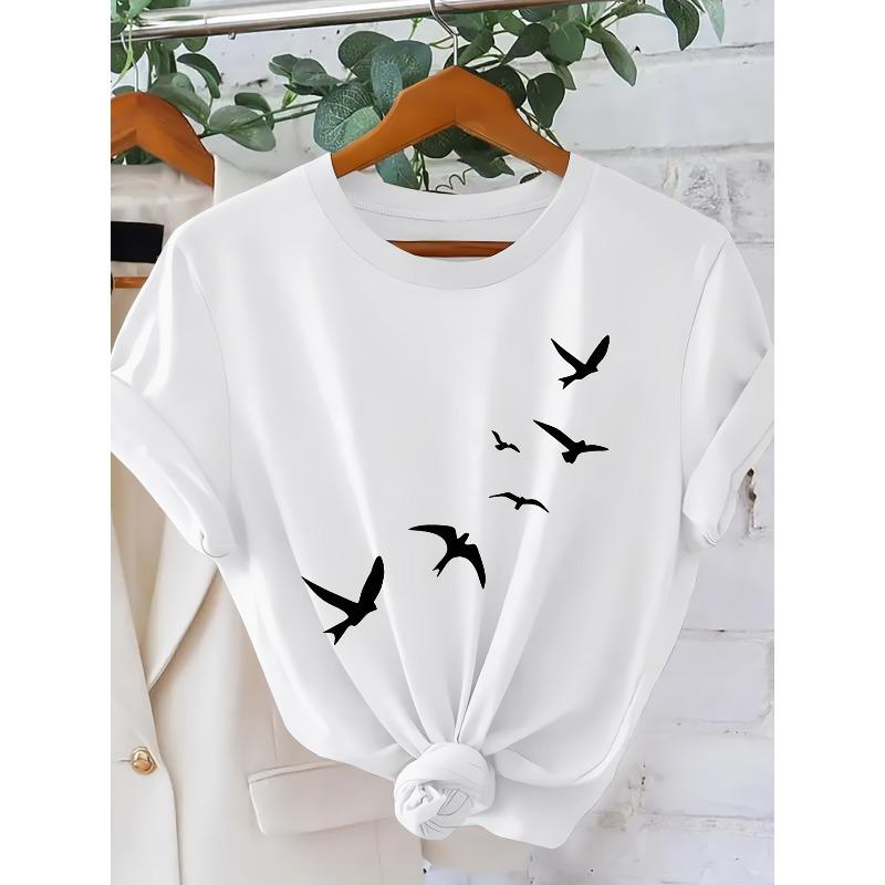 European Size Women'S Modern Style Short-Sleeved T-Shirt with Soaring Swallows Pattern | Casual, Cute, Fashionable