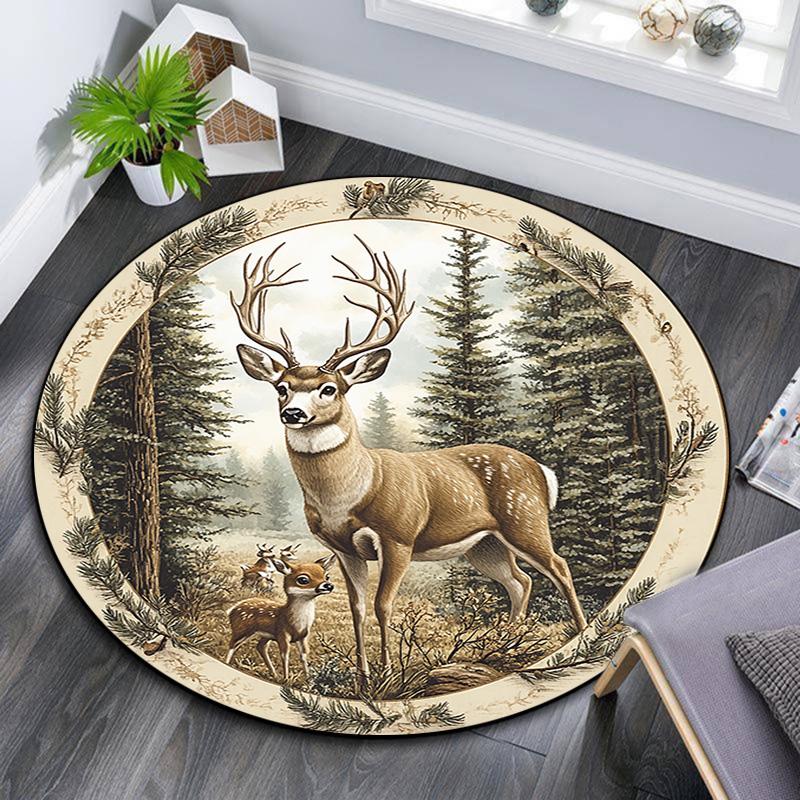 Deer Forest Round Area Rug,Carpet Rug for Living Room Bedroom Sofa Playroom Decor,Non-slip Floor Mat