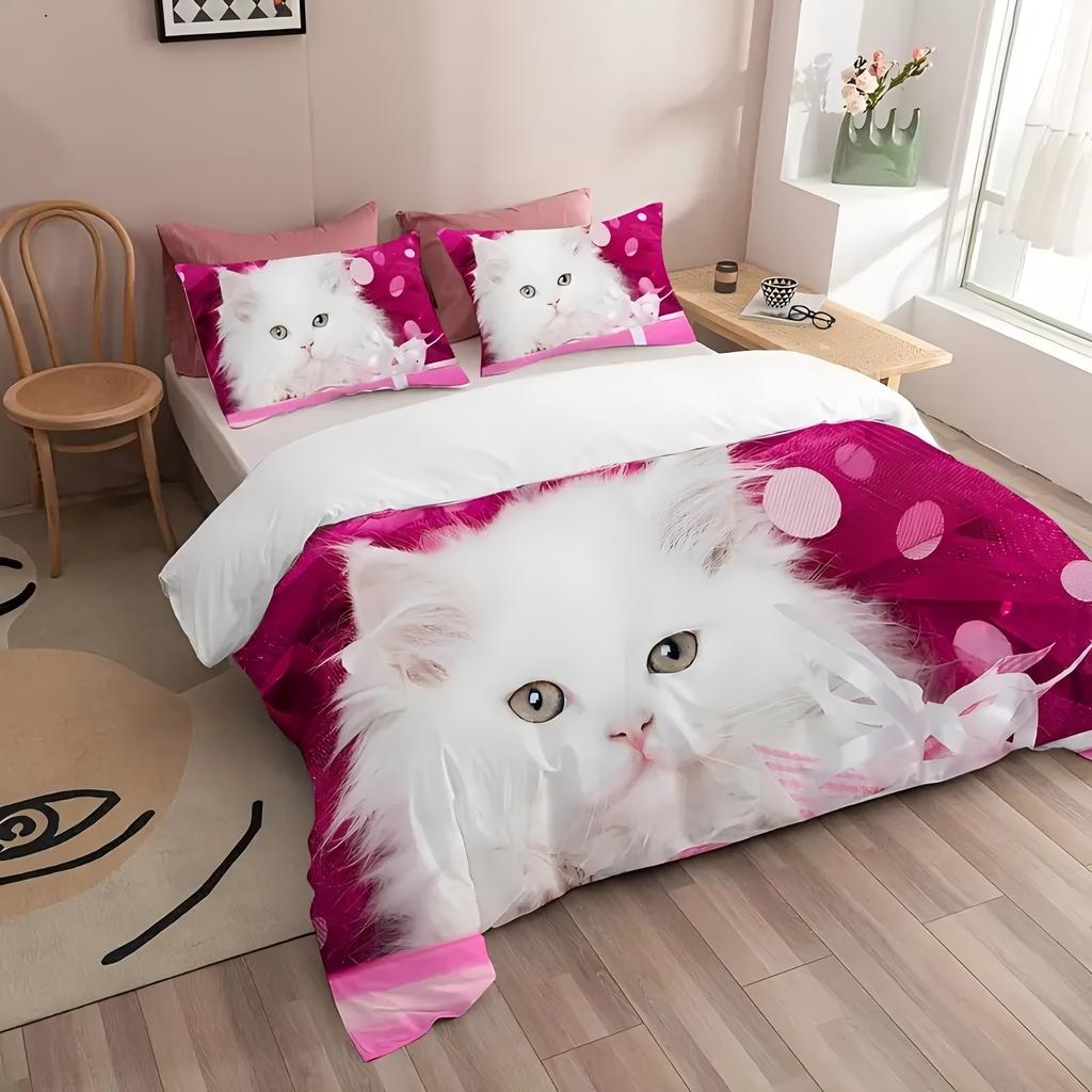 Cute White Kitten Pattern 3d Printed Bedding Set Pink Cute Animal Theme Duvet Cover Soft Comfortable Luxury Quilt Cover Set