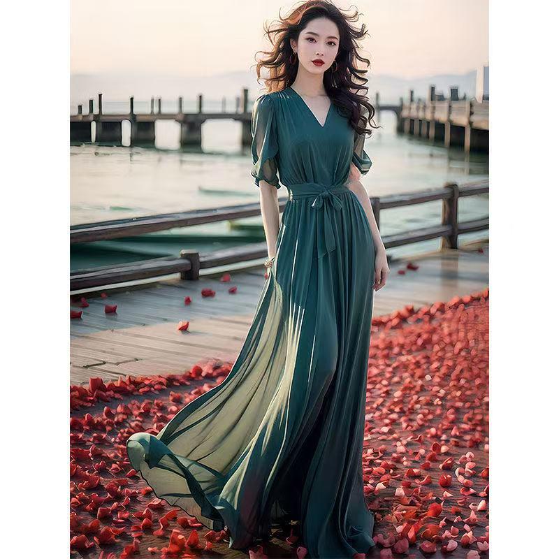 Stylish Green Chiffon Ankle-Length Beach Dress - 2025 Summer Collection