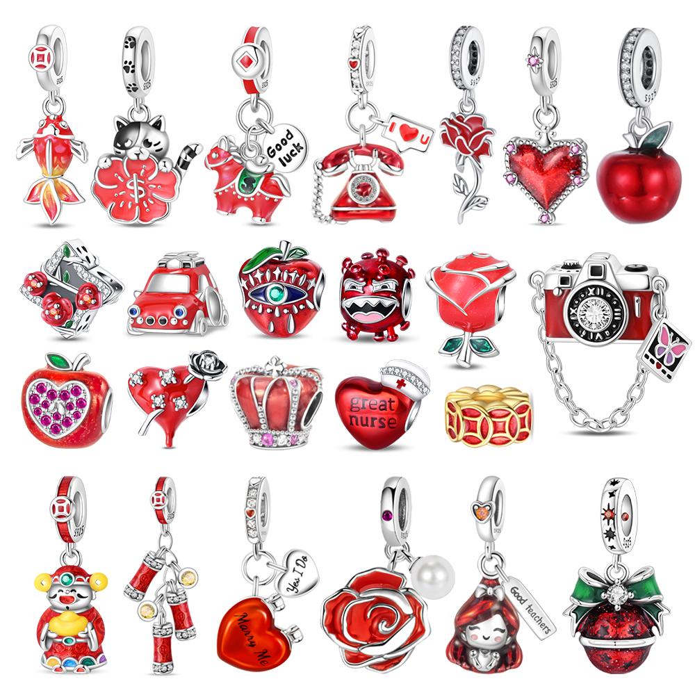 Red Series 925 Silver Camera Apple Heart-Shaped Koi Firecracker God Wealth Charm Fit DIY Bracelet Necklace Party Gifts