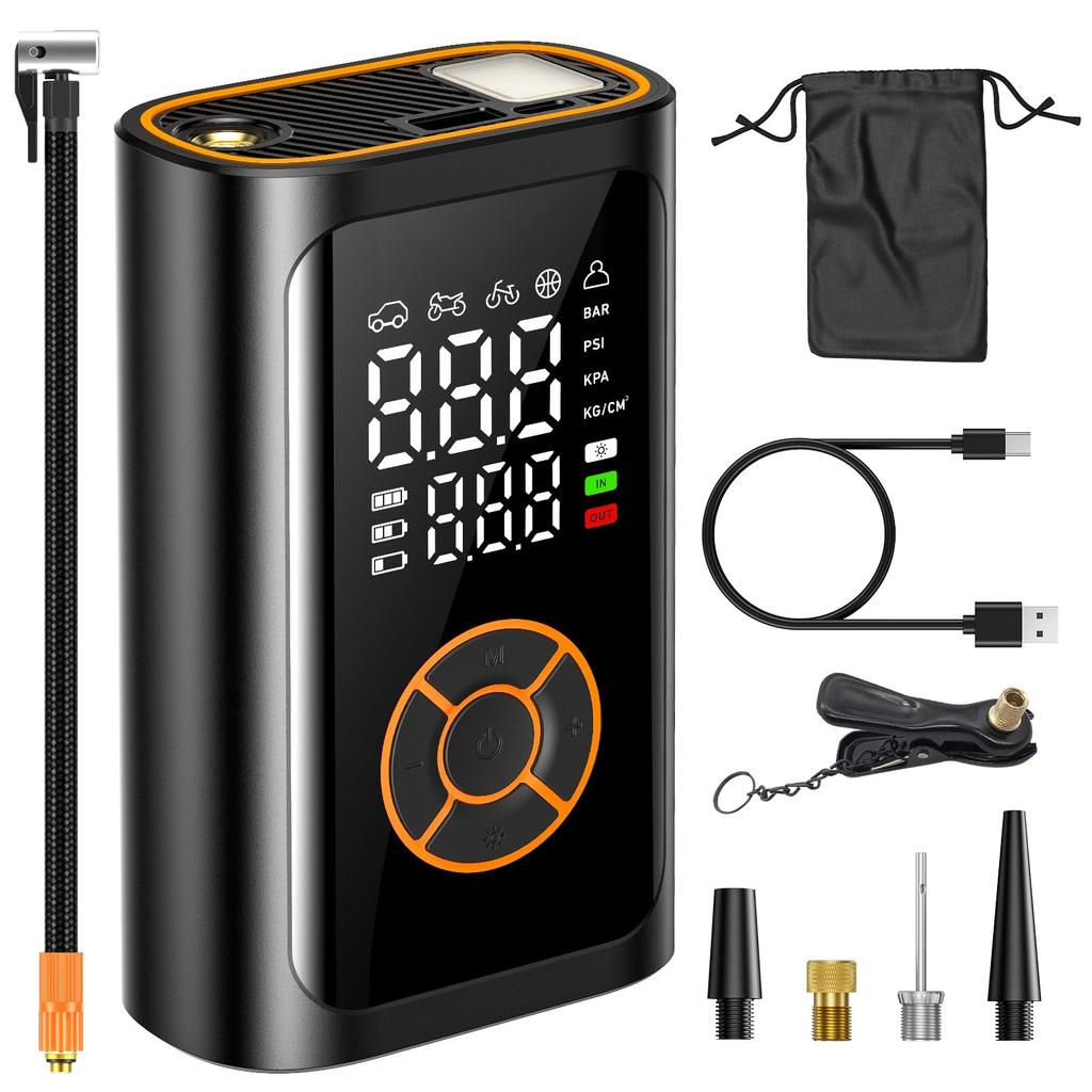 💡[Lightweight and compact with SOS/LED light] Great for emergency preparedness! ✨More portable than ever! At just 396g and measuring 83*46*136mm, it's ultra-lightweight and fits in the palm of your hand, delivering high performance in a compact size. A storage bag makes nozzle organization easy. ✨The SOS/LED light makes it ideal for nighttime work and emergency preparedness, making this an excellent electric pump for all purposes. 🔋 [Long-lasting Continuous Use] The pump is equipped with a large-capacity battery, allowing for extended use. Its rechargeable design eliminates the worry of tangled cords, and its car battery-safe design ensures a long lifespan. ✅ [Emergency Mobile Charging Function] Don't worry about sudden battery drain! Simply turn on the device to instantly recharge. ⚠️ Use this as a backup for outdoor activities or emergencies, not for regular use. Insert the Type-C connector straight.