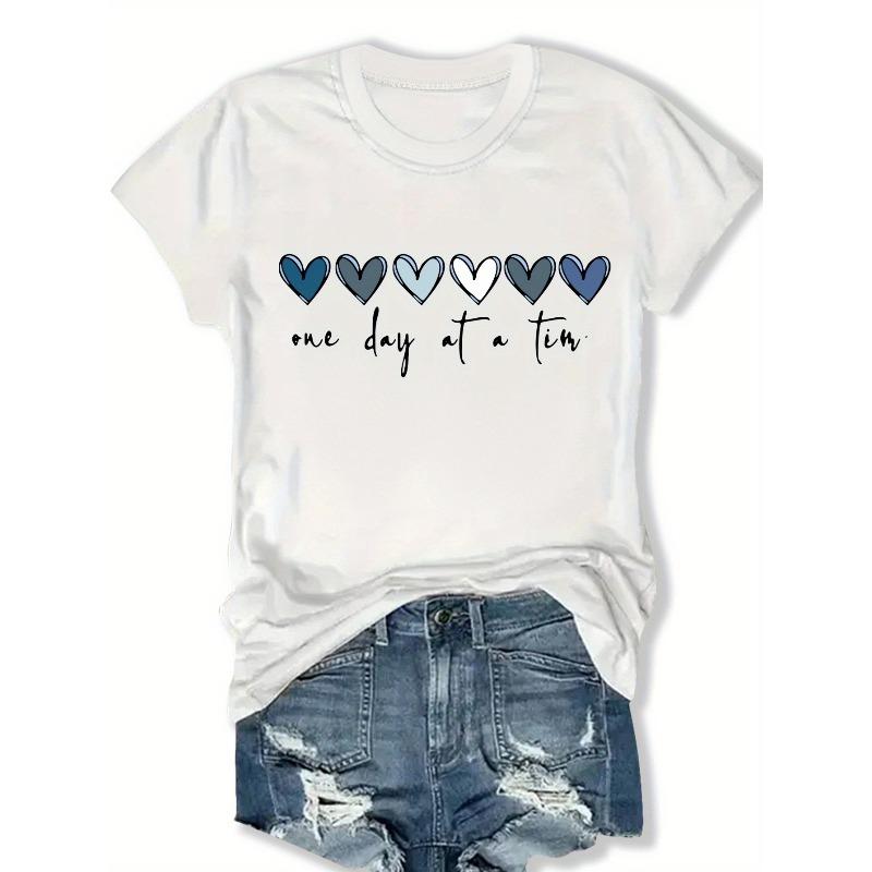Women's Geometric Heart Print Tee One Day At A Time Quote Round Neck Relaxed Fit All-Season White Blue Casual Everyday Top