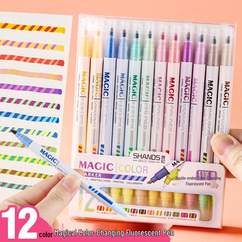 Shan Zhi Double-Headed Color-Changing Fluorescent Highlighter Pen - 12 Colors for Students