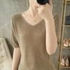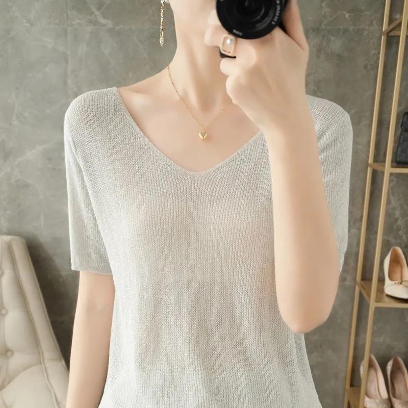 Women's Light Gray V-Neck Knit Top Half Sleeve Slim Fit Casual T-Shirt
