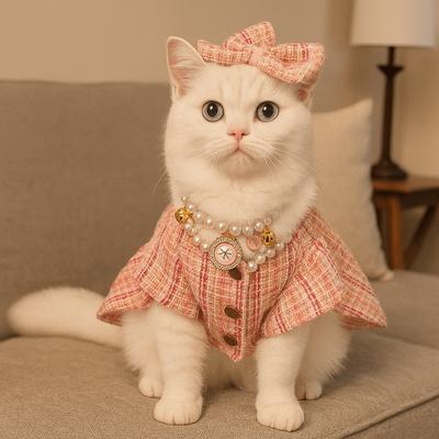 Pet Supplies Cute Puppy Plaid Dress Soft Thin Design Pet Windbreaker Breathable Cat Bow Pearl Coat Autumn Winter