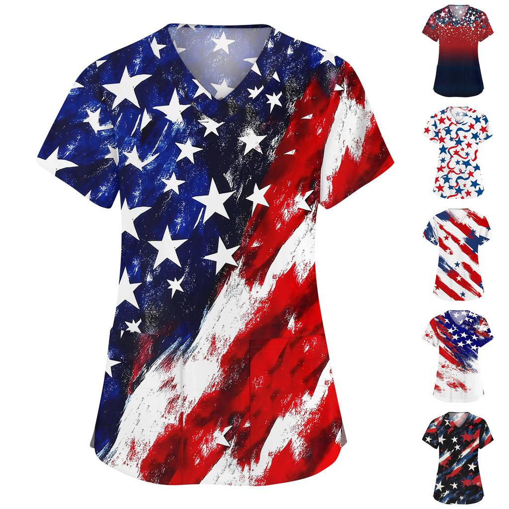 Women's Fashion V-neck Short Sleeve Workwear With Pockets Printed Tops