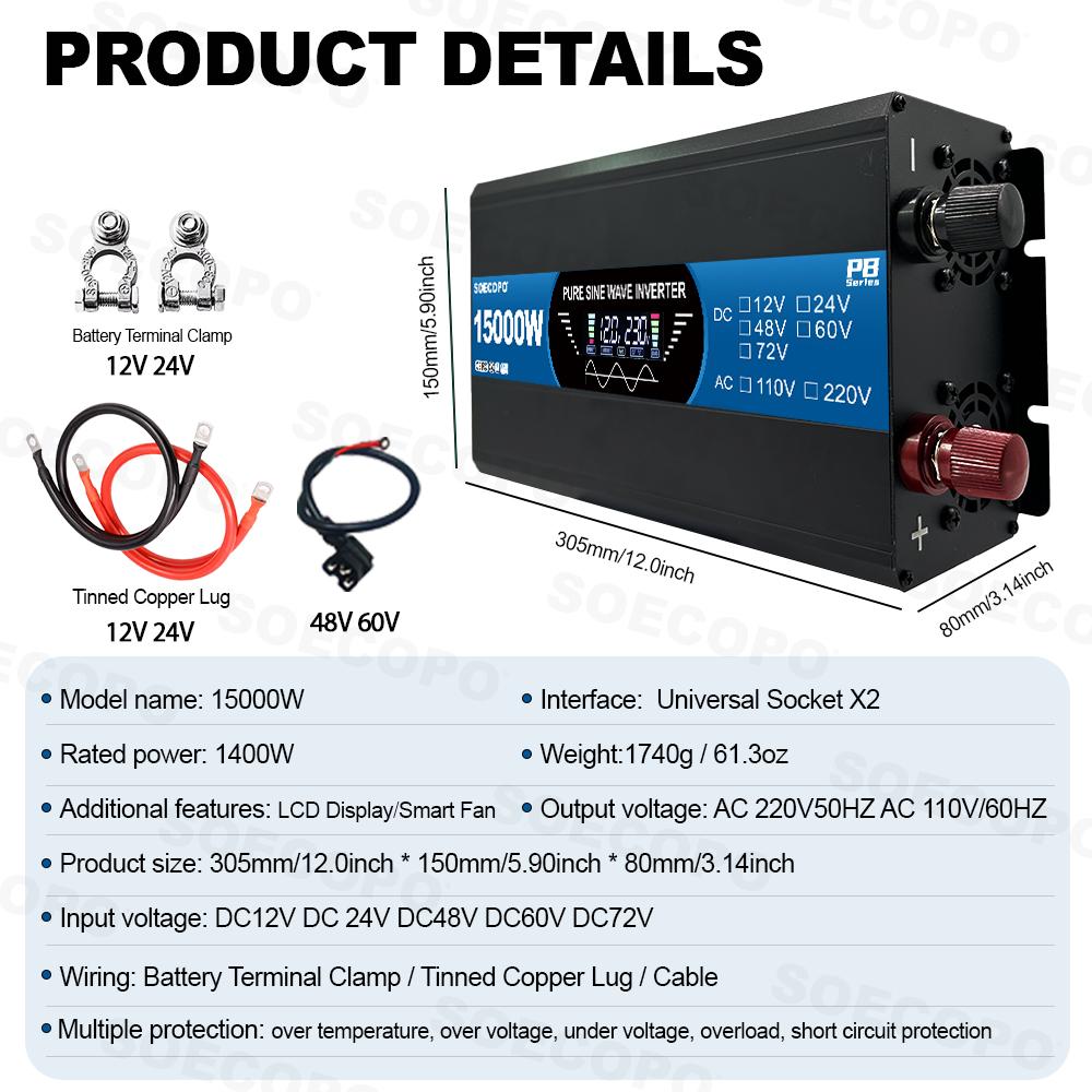 Pure Sine Wave Inverter 15000W 2 Sockets Solar Inverter DC 12/24/48/60/72V To AC 110V/220V Home Outdoor Camping Current Inverter