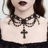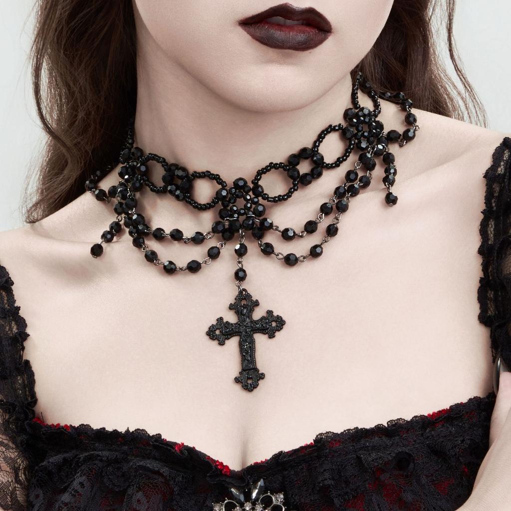 Dark Gothic Cross Pendant Necklace Female, Vintage Multilayer Beaded Tassel Collarbone Collar