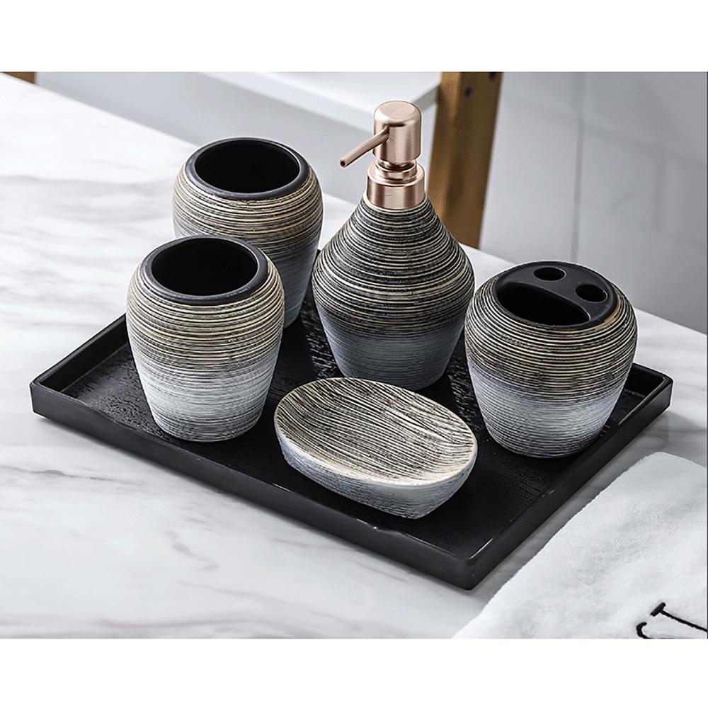 Ceramic Bathroom Accessory Set, 5pcs Soap Dispenser with Tray, Toothbrush Holder, Soap Dish, Vanity Organizer, Bathroom Decor