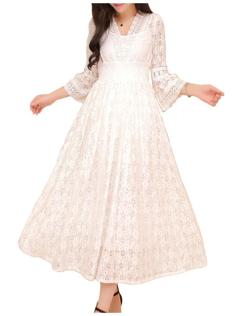 This is a full lace dress made of cotton. The sleeves are see-through lace, and the top comes with an attached camisole inner to prevent it from being see-through. The lower part from the waist down to the knees is lined, so you can wear it without worrying about it being see-through.
