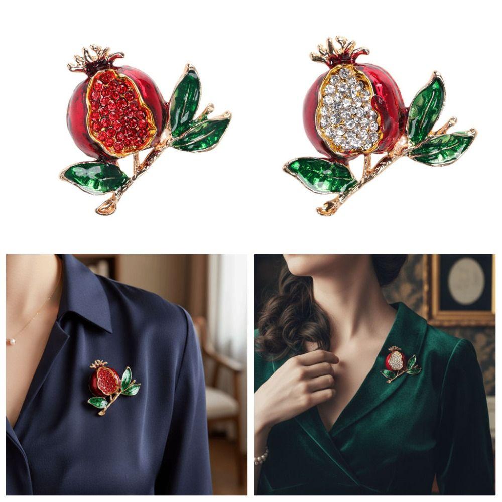 --Enamel & Crystal Accents for Premium Shine:Crafted with smooth enamel to create a vivid, long-lasting pomegranate color and embedded with sparkling crystals that catch the light gently. The combination of enamel's matte texture and crystals' shimmer adds a touch of luxury making the brooch stand out without looking gaudy.