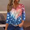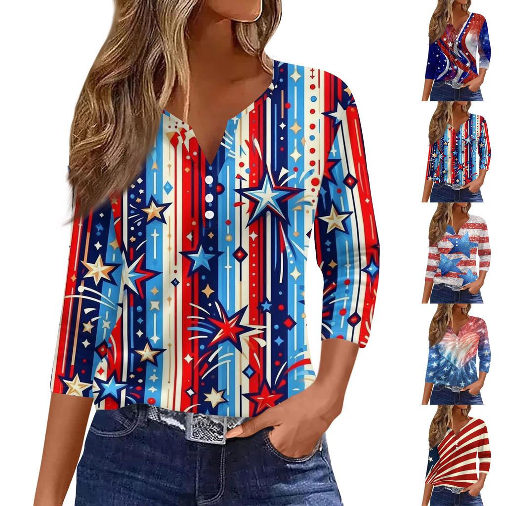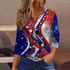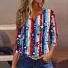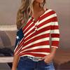 Women's Fashion Casual Independence Day American Flag Stars and Stripes Print Collar V-Neck Three-Quarter Sleeve Decorative Button-Up T-Shirt Top