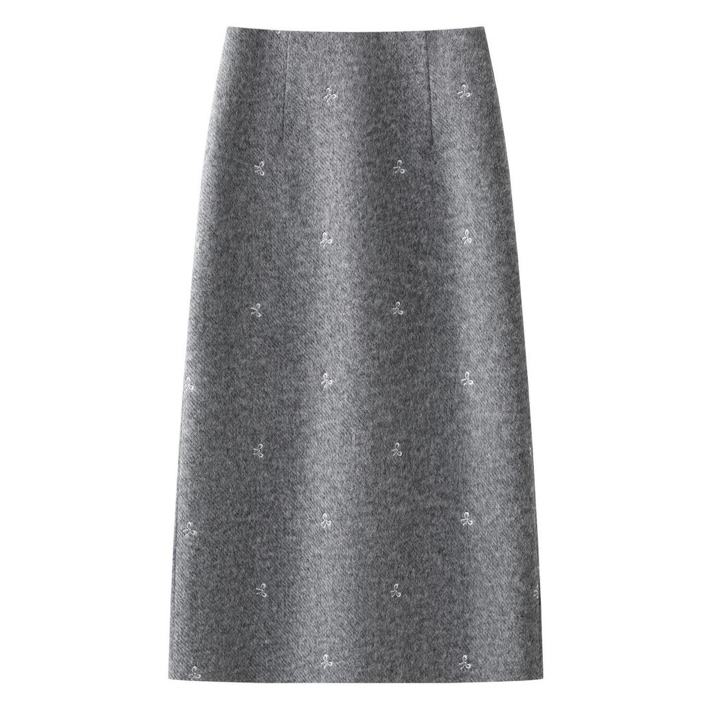Women's Gray Wool Tweed Embroidered A-line Skirt with Slit (Autumn/Winter 2025)