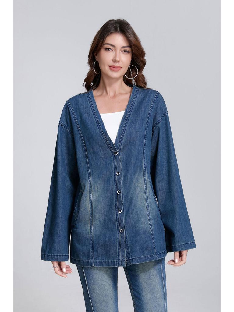 Stylish V-Neck Loose Denim Jacket - Early Autumn Casual Design
