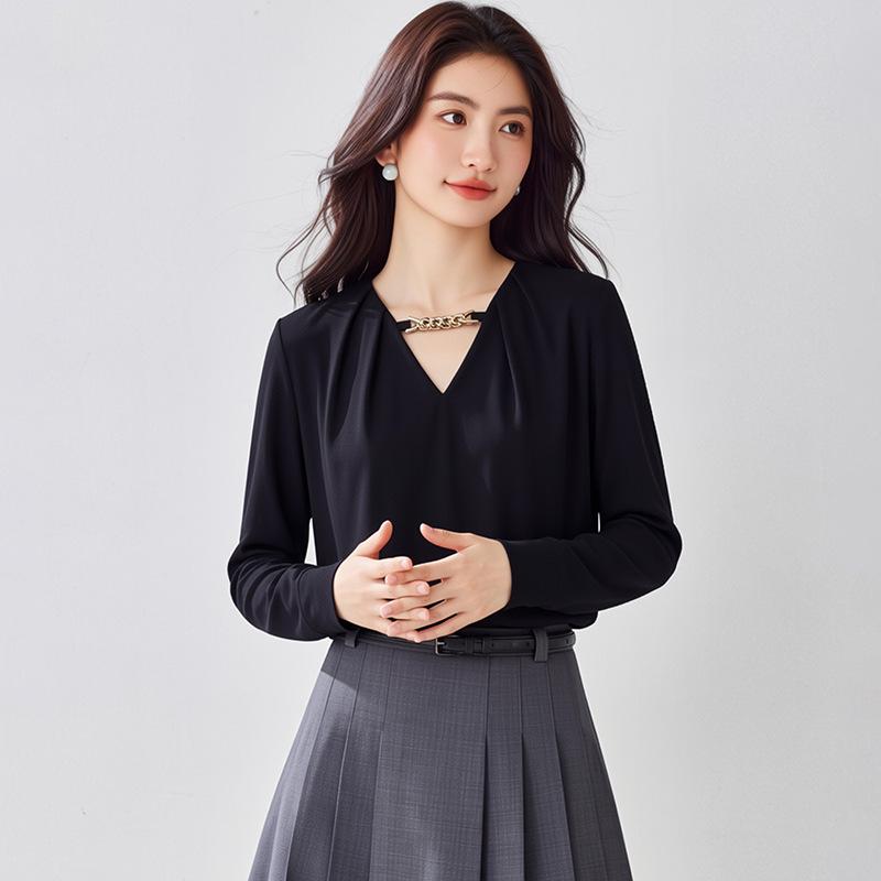 Embrace timeless elegance with this exquisite women's shirt, designed for both spring and autumn wardrobes. Crafted from high-quality polyester with a luxurious soft satin finish, this piece offers a sophisticated aesthetic with its solid pattern. The slim fit accentuates your silhouette, while the long sleeves provide both warmth and style. The v-neckline is adorned with elegant chain-trimmed details, adding a touch of refinement. A waist-cinching design enhances the feminine shape, making this shirt a versatile and chic addition to any wardrobe.