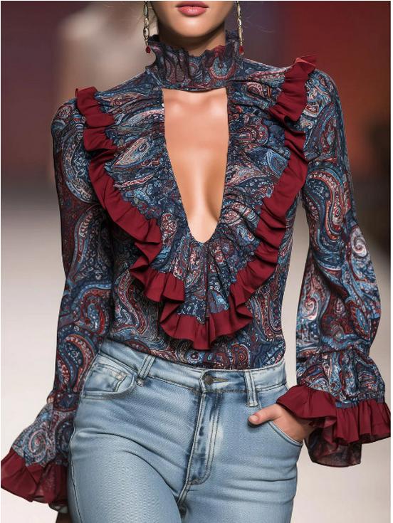Elevate your wardrobe with this charming chiffon shirt, featuring a romantic boho design. Crafted from high-quality polyester, it offers a lightweight and airy feel perfect for any season. The deep V-neckline adds a touch of allure, while the paisley print and ruffled details bring a playful, artistic vibe. The long sleeves make it versatile for both day and evening wear, adding a sophisticated elegance to your outfit.