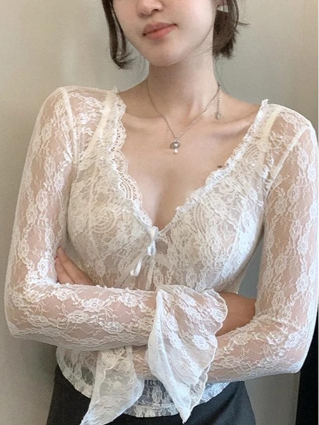 Women's V-Neck Lace Bow Slim-Fit Long Sleeve Shirt for Spring and Autumn Layering