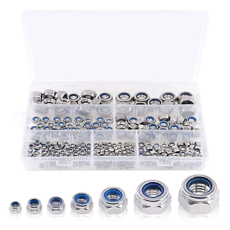 250Pcs Nylon Lock Nut 3/4/5/6/8/10/12mm Nylon Insert Nut Stainless Steel Hexagon Self Locking Nut Assortment Kits