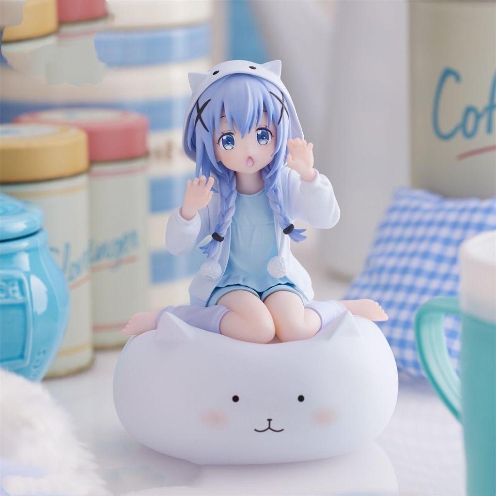 The smooth, matte finish of her loungewear contrasts beautifully with the soft, textured detail of her hair and the plush-like appearance of the white cat-shaped base (adorned with a cute smiling face that complements the character’s vibe), while the soft blue and white color palette creates a calm, soothing aesthetic that stands out in any space. Beyond being a premium collectible, this Chino Kafuu figurine serves as a highly versatile decorative item: place it on your desk to infuse your workspace with a warm, cozy energy that eases stress during long work or study sessions, or position it inside your PC case to add a whimsical, cute anime-themed flair to your gaming setup; its compact size and charming design complement both casual living spaces and tech-focused gaming stations, whether you’re sprucing up your home office, bedroom, or computer desk.