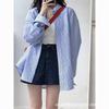 Elevate your summer wardrobe with this stylish striped blue boyfriend long-sleeve shirt. Crafted from a blend of cotton and polyester, this versatile piece offers the perfect balance of comfort and durability. It features a loose fit and long sleeves for a relaxed, breezy feel, making it ideal for sun protection. The turn-down collar adds a touch of sophistication, allowing you to dress it up or down with ease. Whether you're heading to the beach or enjoying a casual day out, this shirt is a must-have staple for those warm, sunny days.